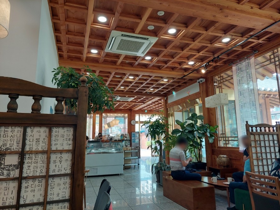 서울 약령시장 한옥카페 '참다정'은 전체적으로 전통적인 멋을 가득 가지고 있지만, 어찌보면 전통의 미를 바탕으로 하면서 모던한 매력을 더한 인테리어를 가지고 있는 것 같았습니다. 사진에서 보이는 대리석 바닥과 다소 이색적인 테이블과 의자 등이 차분하고 진중한 고전의 미에 다소 변화를 주는 인테리어 요소라고 할까요...